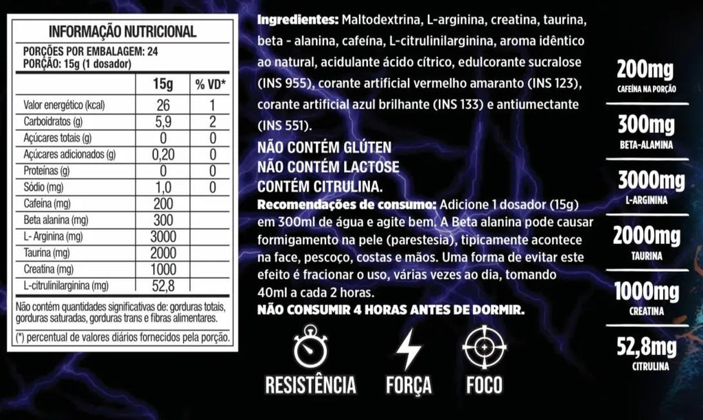 Diluir 1 scoop (15g) em 200 ml de água e consumir 30 minutos antes da atividade física.